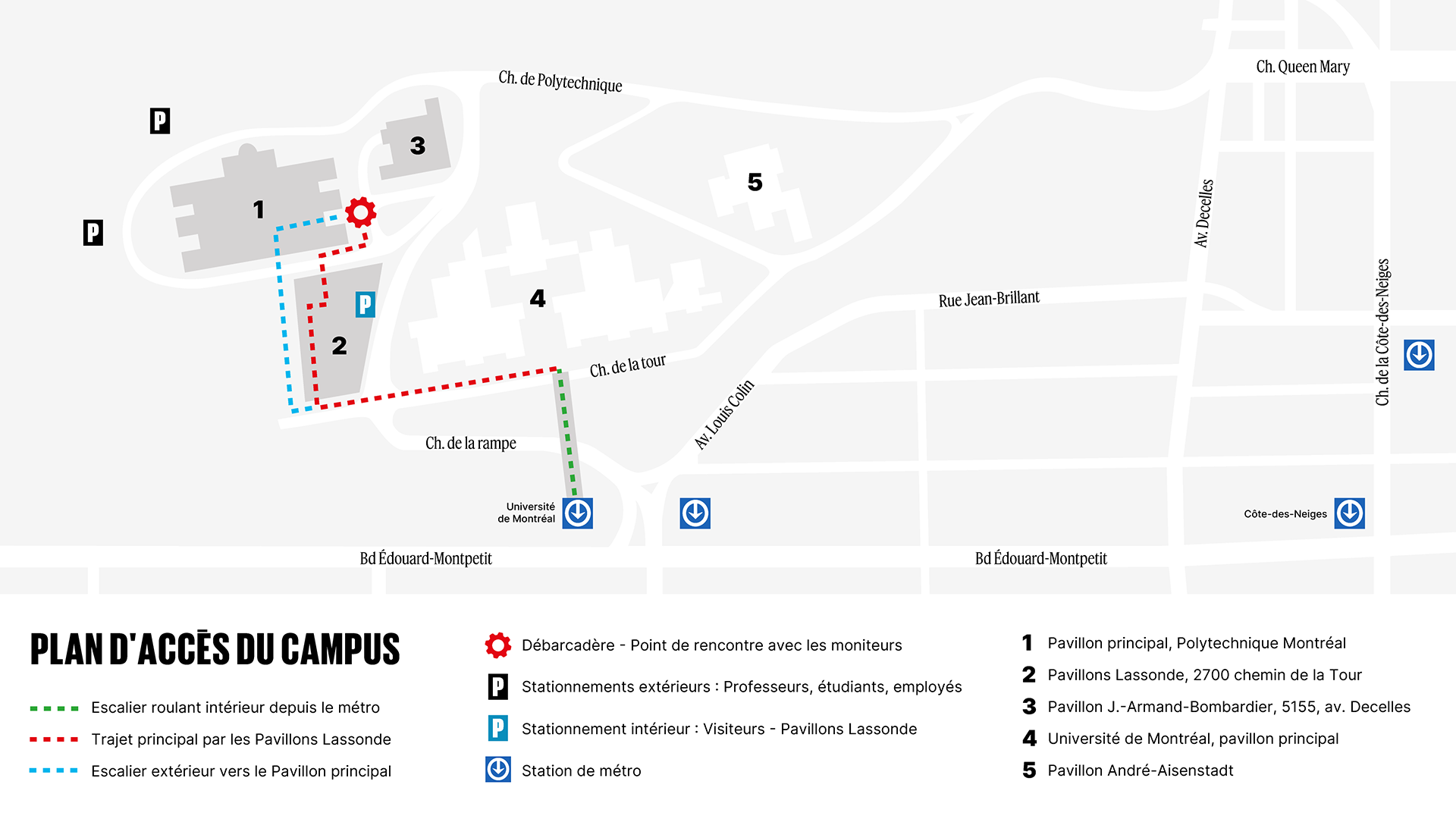Se rendre à l'une des deux entrées du Campus de l'Université de Montréal et suivre les indications vers Polytechnique Montréal.